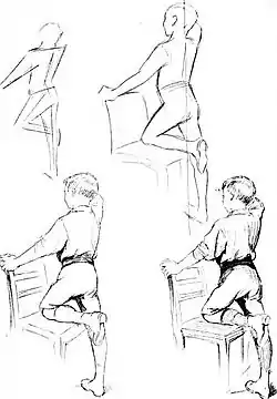 By 'an easy pose' one that represents a simple position is meant. If we begin by trying to draw some one with body huddled together, legs crossed, neck twisted, and eyes gazing into ours, we shall soon be very confused.