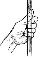 For instance, your own left hand holding a small object such as a coin, a flower-stem, or a reel of cotton. The latter, being a light object, you would hold lightly between your first finger and your thumb, supported by the second and third fingers.