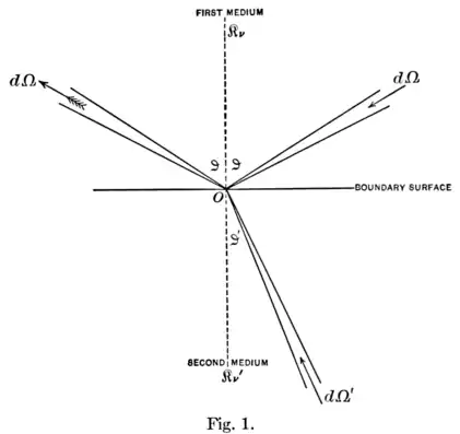 We consider now two homogeneous isotropic media in thermodynamic equilibrium separated from each other by a plane surface. Since the equilibrium will not be disturbed if one imagines for the moment the surface of separation between the two substances to be replaced by a surface quite non-transparent to heat radiation, all of the foregoing laws hold for each of the two substances individually. Let the specific intensity of radiation of frequency , polarized in any arbitrary plane within the first substance (the upper in Fig. 1)[1], be and that within the second substance (we shall in general designate with a dash those quantities which refer to the second substance). Both quantities and , besides depending upon the temperature and the frequency, depend only upon the nature of the two substances, and, in fact, these values of the intensity of radiation hold quite up to the boundary surface between the substances, and are therefore independent of the properties of this surface.
