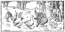 So they went along, and they went along, and they went along, till they met Turkey-lurkey. "Where are you going, Henny-penny, Cocky-locky, Ducky, daddies, and Goosey-poosey?" says Turkey-lurkey. "Oh! we're going to tell the king the sky's a-falling," said Henny-penny, Cocky-locky, Ducky-daddles, and Goosey-poosey. "May I come with you, Henny-penny, Cocky-locky, Ducky-daddles, and Goosey-poosey?" said Turkey-lurkey. "Oh, certainly, Turkey-lurkey," said Henny-penny, Cocky-locky, Ducky-daddies, and Goosey-poosey. So Henny-penny, Cocky-locky, Ducky-daddles, Goosey-poosey, and Turkey-lurkey all went to tell the king the sky was a-falling.