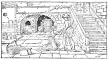upon the hand of the poor lady. The sword cut off the hand, which jumped up into the air, and fell of all places in the world into Lady Mary's lap. Mr. Fox looked about a bit, but did not think of looking behind the cask, so at last he went on dragging the young lady up the stairs into the Bloody Chamber.