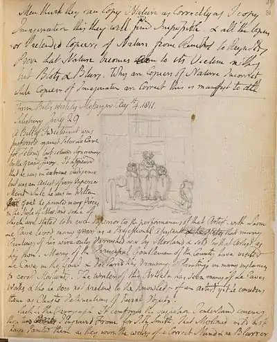 - ↑ "The Complete Poetry & Prose of William Blake", ed. by David V. Erdman, Anchor Books, 1988, p. 694-5. [Memoranda from the Notebook] From Bells Weekly Messenger The paragraph from Salisbury occurs in the 8th page, under the heading SUMMER ASSIZES. In the Notebook Blake copied it beside and below his emblematic drawing of Ugolino in prison. In his comment Blake refers to two prints he engraved, from paintings by Morland, i.e. Le Cave. The deleted word is confusing, though legible enough, because he began by writing about “two Prints” but concluded by turning the focus on those two (paintings) he engraved from.