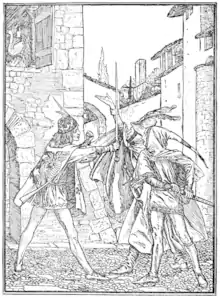 Then each of the three fell deeply in love with her, and began to say how much he longed to have her for his wife! Scarcely had the wish been spoken, than each broke out into a great rage with the others, for wanting to have poor Cherry, who could only be wife to one of them. At last all drew their swords, and a dreadful battle began. The fight lasted long, and their rage grew hotter and hotter, when at length the old fairy, to whom the garden belonged, hearing the uproar, came to her gate to know what was the matter. Finding that it was all about her fair neighbour, her old spite for the loss of the cherries broke forth at once, worse than ever. "Now then," said she, "I will have my revenge"; and in her rage she wished Cherry turned into an ugly frog, and sitting in the water, under the bridge at the world's end. No sooner said than done; and poor Cherry became a frog, and vanished out of their sight. The princes now had nothing to fight for; so, sheathing their swords again, they shook hands as brothers, and went on towards their father's home.