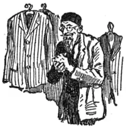 So a pact was sealed between John Blake, conscientious appraiser of metal prospects, and Peter Hewes, millionaire moth in an elevator chrysalis. Before the Red Front Cash Store closed that night its delighted proprietor had disposed of some old stock hard to move. Item: one Prince Albert coat with appropriate trousers and and white waistcoat; one marked down silk hat which could be made a perfect fit with newspaper folded in the sweatband; one pair of No. 10 patent leather shoes and spats a little moth eaten. A nearby pawnshop yielded a rosewood cane with gold head, ancient and honorable patent to moneyed nobility in Nevada.