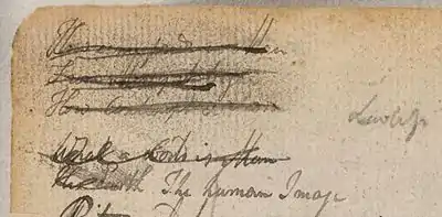 - ↑ As we see it is heavily deleted, and unfinished. Because visually, the poem that immediately follows, “The human Image” (1st draft version of “The Human Abstract” (see Songs of Experience), "looks like a continuation of the same poem, and the title being inserted later" as suggested by David V. Erdman ("The Complete Poetry & Prose of William Blake", Anchor Books, 1988, p. 471