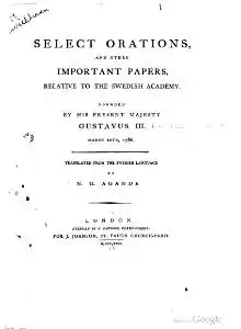 Swedish Academy, Dec. 20, 1787, by Mr. de Rosenstein, perpetual Secretary, &c.6. Discourse delivered by the Count Oxenstierna, &c. March