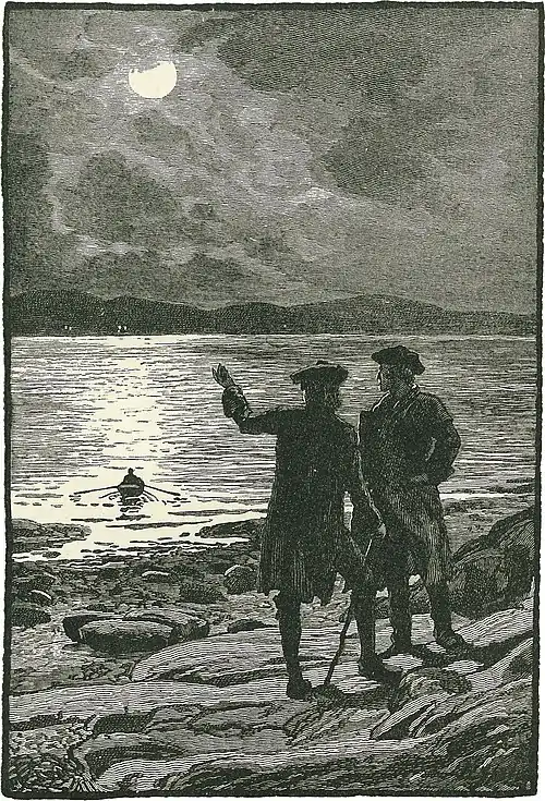 The day came to an end with the same brightness; the night fell quiet and clear; lights came out in houses and hamlets and then, one after another, began to be put out; but it was past eleven, and we were long since strangely tortured with anxieties, before we heard the grinding of oars upon the rowing-pins. At that, we looked out and saw the lass herself coming rowing to us in a boat. She had trusted no one with our affairs, not even her sweetheart, if she had one; but as soon as her father was asleep, had left the house by a window, stolen a neighbour's boat, and come to our assistance single-handed.