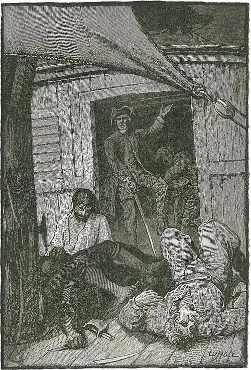 He had dropped his cutlass as he jumped, and when he felt the pistol, whipped straight round and laid hold of me, roaring out an oath; and at that either my courage came again, or I grew so much afraid as came to the same thing; for I gave a shriek and shot him in the midst of the body. He gave the most horrible, ugly groan and fell to the floor. The foot of a second fellow, whose legs were dangling through the skylight, struck me at the same time upon the head; and at that I snatched another pistol and shot this one through the thigh, so that he slipped through and tumbled in a lump on his companion's body. There was no talk of missing, any more than there was time to aim; I clapped the muzzle to the very place and fired.
