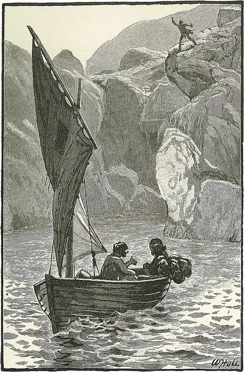 Well, all of a sudden, a coble with a brown sail and a pair of fishers aboard of it, came flying round that corner of the isle, bound for Iona. I shouted out, and then fell on my knees on the rock and reached up my hands and prayed to them. They were near enough to hear—I could even see the colour of their hair; and there was no doubt but they observed me, for they cried out in the Gaelic tongue, and laughed. But the boat never turned aside, and flew on, right before my eyes, for Iona.