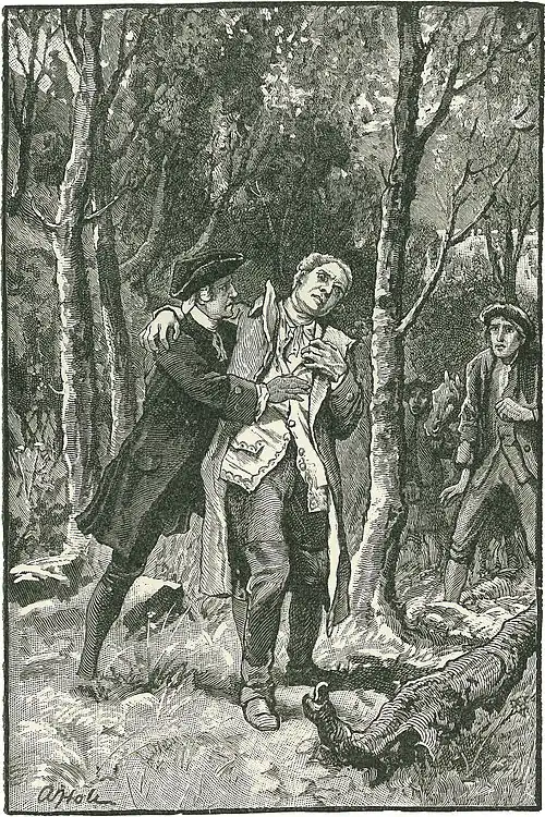 The lawyer and the sheriff's officer were standing just above the road, crying and waving on me to come back; and on their left, the red-coats, musket in hand, were beginning to struggle singly out of the lower wood.