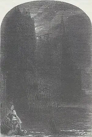 The gate was so familiar, and so like a companion, that they put down Maggy’s basket in a corner to serve for a seat, and keeping close together, rested there for some time. While the street was empty and silent, Little Dorrit was not afraid; but when she heard a footstep at a distance, or saw a moving shadow among the street lamps, she was startled, and whispered, ‘Maggy, I see some one. Come away!’ Maggy would then wake up more or less fretfully, and they would wander about a little, and come back again.