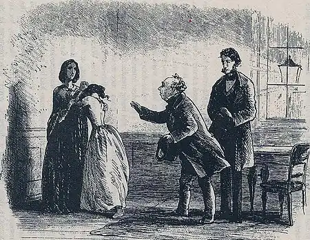 He returned home one evening from an interview with her father, who had mentioned that she was out visiting—which was what he always said when she was hard at work to buy his supper—and found Mr Meagles in an excited state walking up and down his room. On his opening the door, Mr Meagles stopped, faced round, and said: