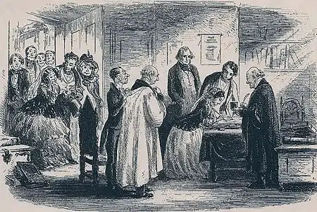 Then they went up the steps of the neighbouring Saint George’s Church, and went up to the altar, where Daniel Doyce was waiting in his paternal character. And there was Little Dorrit’s old friend who had given her the Burial Register for a pillow; full of admiration that she should come back to them to be married, after all.