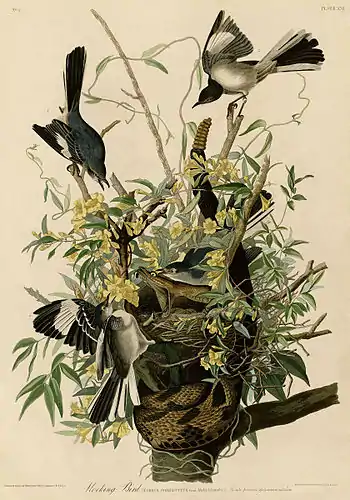 The musical powers of this bird have often been taken notice of by European naturalists, and persons who find pleasure in listening to the song of different birds whilst in confinement or at large. Some of these persons have described the notes of the Nightingale as occasionally fully equal to those of our bird. I have frequently heard both species in confinement, and in the wild state, and without prejudice, have no hesitation in pronouncing the notes of the European Philomel equal to those of a soubrette of taste, which, could she study under a Mozart, might perhaps in time become very interesting in her way. But to compare her essays to the finished talent of the Mocking Bird, is, in my opinion, quite absurd.