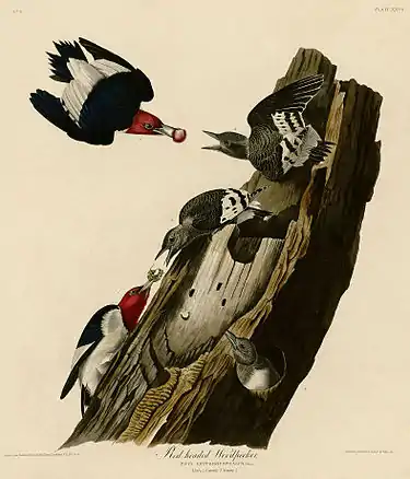 In Kentucky and the Southern States, many of these birds are killed in the following manner. As soon as the Red-heads have begun to visit a Cherry or Apple tree, a pole is placed along the trunk of the tree, passing up amongst the central branches, and extending six or seven feet beyond the highest twigs. The Woodpeckers alight by preference on the pole, and while their body is close to it, a man standing at the foot of the pole gives it a smart blow with the head of an axe, on the opposite side to that on which the Woodpecker is, when, in consequence of the sudden and violent vibration produced in the upper part, the bird is thrown off dead.