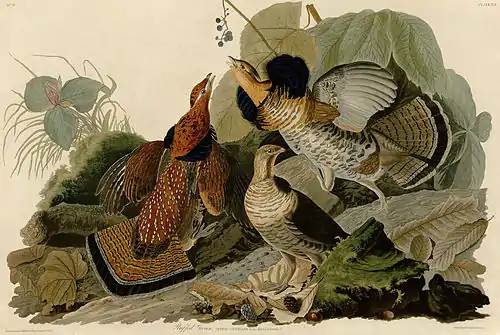The charming groves which here and there contrast so beautifully with the general dull appearance of those parts of Kentucky and Tennessee, to which the name of Barrens is given, are sought by the Ruffed Grouse. These groves afford them abundant food and security. The gentle coolness that prevails in them during the summer heat is agreeable and beneficial to these birds, and the closeness of their undergrowth in other spots moderates the cold blasts of winter. There this species breeds, and is at all times to be found. Their drumming is to be heard issuing from these peaceful retreats in early spring, at the same time that the booming of their relative, the Pinnated Grouse, is recognised, as it reaches the ear of the traveller, from the different parts of the more open country around. In such places as the groves just mentioned, the species now before you, kind reader, is to be met with, as you travel towards the south, through the whole of Tennessee and the Choctaw Territory; but as you approach the city of Natchez they disappear, nor have I ever heard of one of these birds having been seen in the State of Louisiana.
