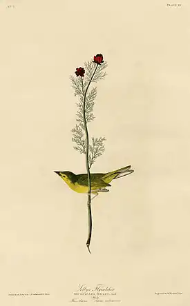 On the 4th July, while searching with care about the same place, to find its nest or the female, I shot another of these birds, which I found to be a female. It differed only in being rather smaller, darker above, and paler beneath. On the 27th September of the same year, I shot a second male in beautiful plumage, six or seven miles off, in a different direction, in the same State. Finding the pretty flower on which the bird is drawn, in the immediate neighbourhood, and growing wild, although I am assured it is originally from Europe, I have represented it, thinking it might contrast well with the Fly-catcher in its richly coloured flowers, and be assimilated to it in that of its stem and leaves. This flower is found in damp places, in Louisiana only, at least I have not met with it in the woods of any other State.
