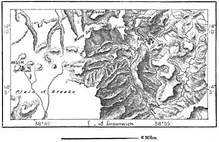 fallen from its former state, is still regarded as holy; it is the city where the coronation of the emperor takes place, and fugitives here find a sanctuary more respected than most of the convents. Its monasteries are inhabited by eight hundred priests, and by hundreds of youths who are being educated for the same profession. Aksum, the Aksemeh of the Abyssinians, lies some 12 miles from Adua on a romantic site 1,000 feet more elevated above the sea. Here its groups of houses and churches, each surrounded by groves and gardens which clothe the slope of the hill with verdure, are enframed on one side by dark basalt walls, forming a striking background to this charming picture. According to tradition, Aksum was founded by Abraham; a dignitary of the church, hardly inferior in rank to the echaghé or to the abuna, here claims to be the guardian of the "tables of