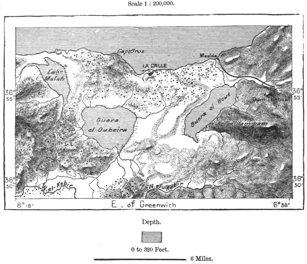 Algerian river. The sources of the Sherf, its chief headstream, are intermingled on the Aïn-Beide plateau with those of the Tunisian Mejerda and its affluent, the Wed Meleg. At a former geological epoch the plain now traversed by the lower Seybouse formed a marine inlet, of which the shallow Lake Fetzara is a remnant. Between the sea and the eastern Wed-el-Kebir, at its mouth known as the Mafrag, the town of La Calle is encircled by a girdle of three lakes — the Guera-(Guraa)-el-Melah, or "Salt Lagoon;" the freshwater Guera-el-Ubeïra draining during the floods to the El-Kebir; and the Guera-el-Hat, or "Fish Lagoon," which reaches the sea through the sluggish and sedgy El-Mesida.