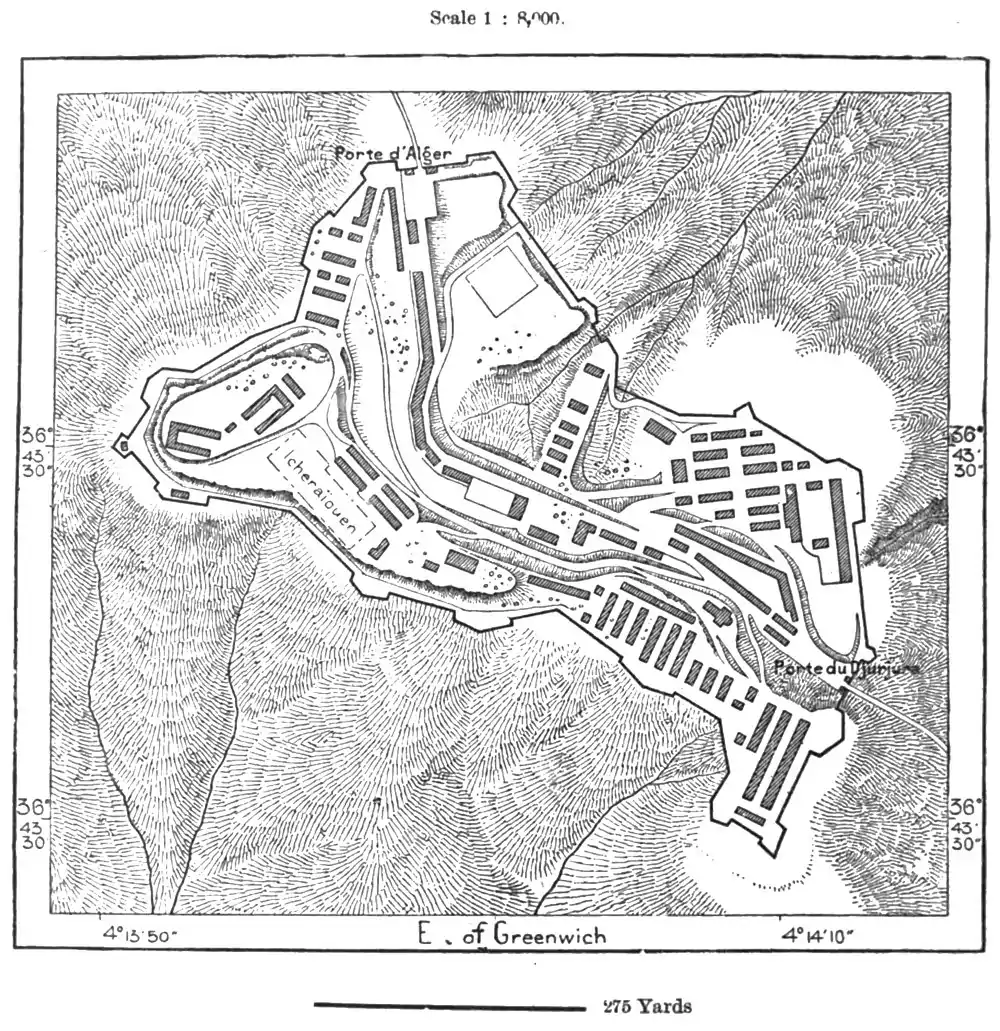 follow from north-east to south-west along the line of the future route between Algiers and Bougie. But at present the trade of this district is centred in the modern town of Tizi-Uzu (the Arab Fuj-el-Guendul), which lies at an altitude of 850 feet to the west of an extensive plain where the Wed Sebau and Wed Aissi unite their turbulent waters. Few places in Algeria have developed more rapidly than this administrative capital of Kabylia, whose market is frequented by thousands of natives from the surrounding districts. In the hills to the north-west