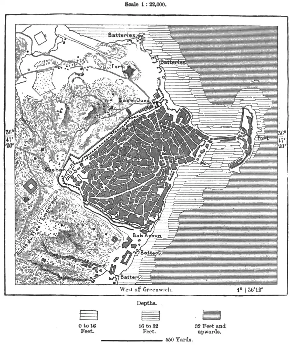 Southwards also the city is continued by the districts of Agha, Mustapha, and Belcourt, stretching away beyond the Bab-Azun, the gate where criminals were crucified, dead or alive. The united communes of Algiers, Saint-Eugène, and Mustapha have a total length of some 6 miles, although, at many points hemmed in between the hills and the sea, the city is scarcely more than 200 yards broad.