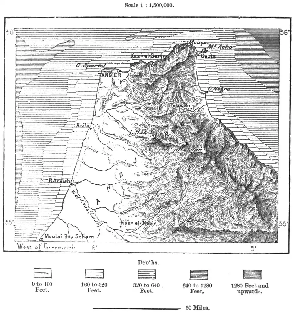 pedestal. The running waters, grassy tracts, wooded and cultivated slopes, render this angle of the continent one of the most delightful regions in Mauritania, forming in this respect a striking contrast with the arid and rugged escarpments of the Rif, which stretches thence eastwards.