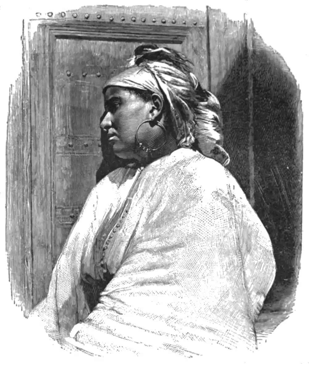 fair being higher than that of a dark bride. Nevertheless tho Hartaniat women are often distinguished by their beauty, most of them having lovely and expressive eyes, and in their youth bright features combined with an extremely graceful carriage.