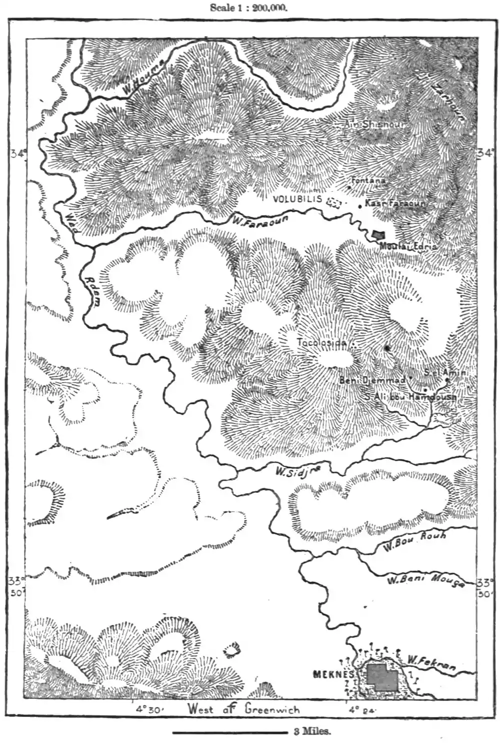 by well-preserved ramparts, and like other towns of the empire contains a fortified kasbah, and a mellah, or Jewish quarter, surrounded by separate walls. These fortifications were built by Christian captives, who when worn out by fatigue were despatched and built into the masonry. The broad streets of Mequinez are