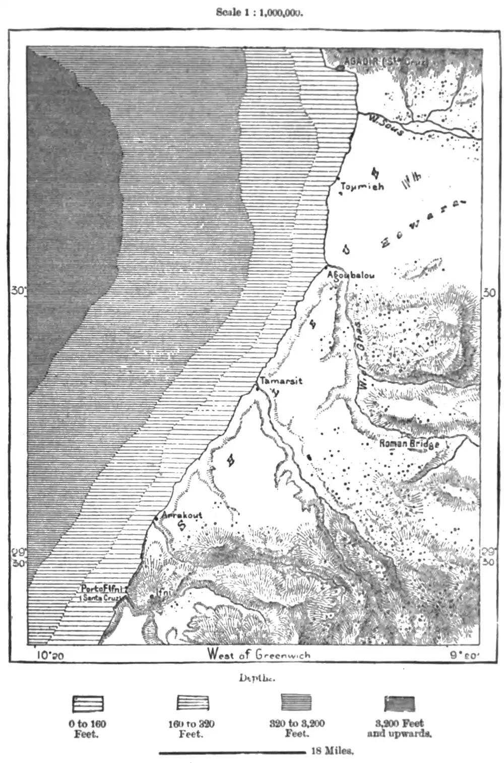 This estuary exactly faces the island of Lanzagote in the Canary Archipelago, while the Wed itself has its source at least 330 miles east of Marrakesh in the Atlas highlands. The inhabitants of its basin, estimated by Rohlfs at two hundred