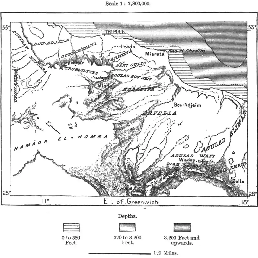 West of Tripoli, towards the Tunisian frontier, the chief tribes are the Wershefanas,