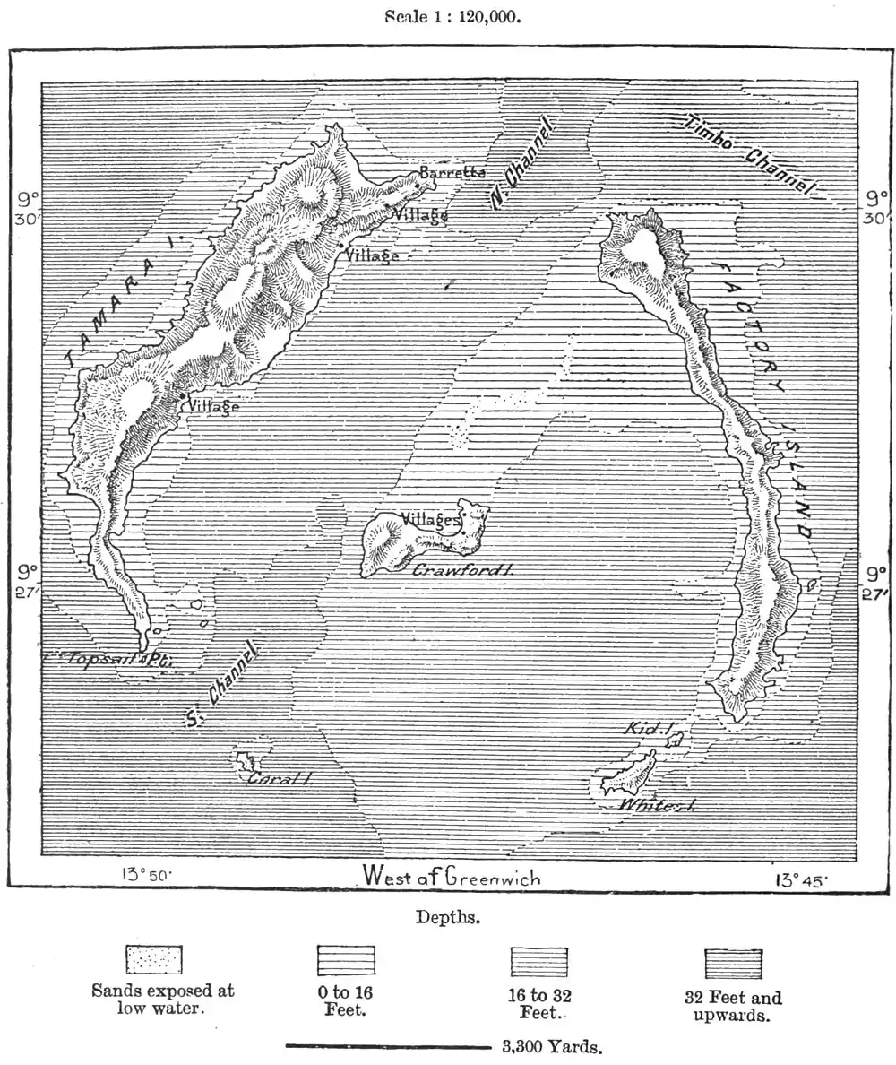 in the dry season, although rendered unnavigable by falls and rapids. For a stretch of 120 miles in a straight line below these obstructions its course has been surveyed by no explorer, so that it is still somewhat uncertain whether the Kakriman is the upper course of the Brameya, which enters the sea midway between the Pongo and the Mallecory at the broad estuary of the Sangarea. According to the natives the Brameya is navigable for one or two hundred miles by craft