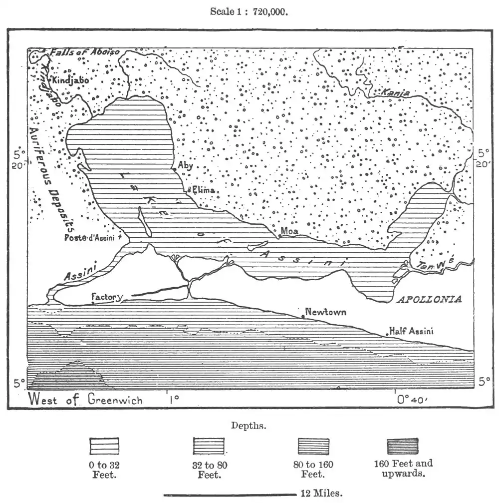 The approach to the Assini (Issini) lagoon, some 22 miles farther east, resembles that of Lake Ebrié, but is shallower, more tortuous, and inaccessible to craft drawing more than 5 feet. But in the interior the lagoons ramify into numerous deep creeks and inlets, the two chief influents being the Bia or Kinjabo in the north-west, and the Tanwé, forming in the east the frontier of the French possessions.