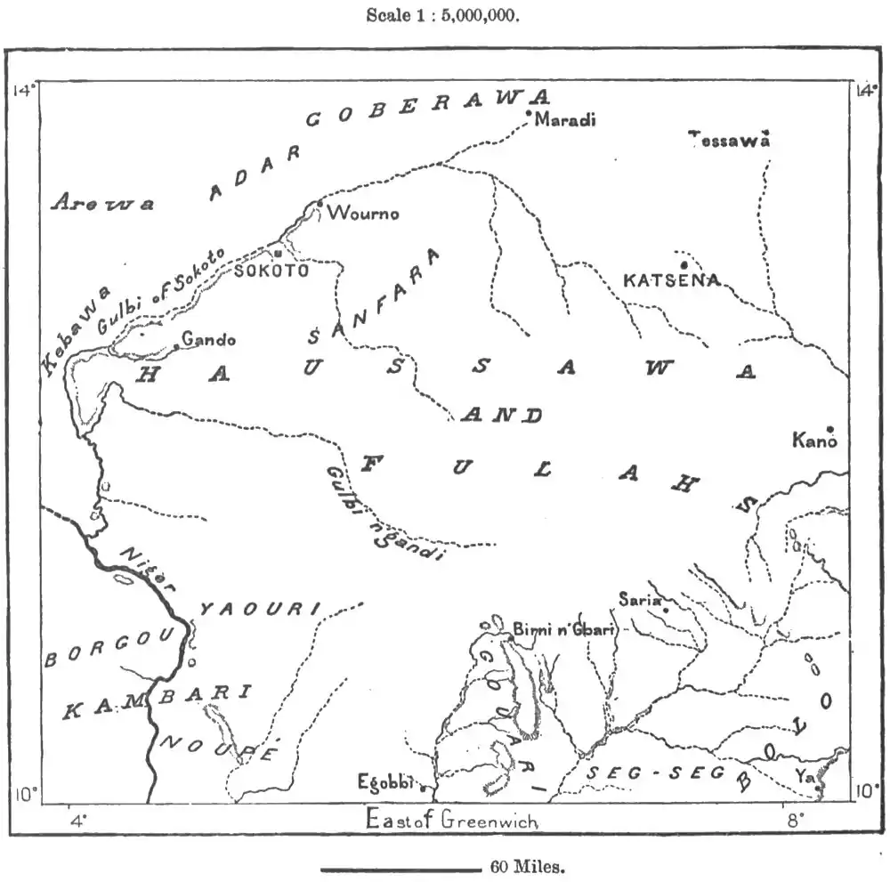 activity of the inhabitants, and compares the incessant traffic on the highway between the cities of Gando and Sokoto to the stir and bustle about an anthill. The horizon is bounded by large villages, each as populous as towns elsewhere.