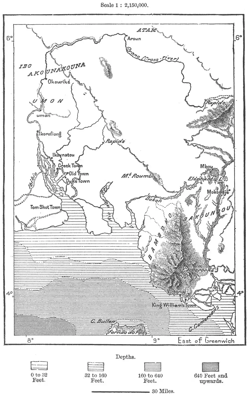 from Bonny alone. Owing to the multitude of tribes and languages now represented in this district, English has become the almost indispensable medium of general intercourse. Near the extreme point of the coast below Bonny stands the port of Finnema (Fammena), by the English sailors generally called Jew-Jew-town,