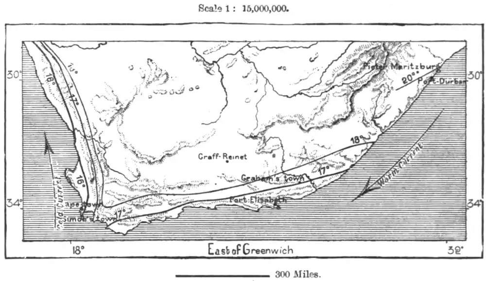 Except at some points of the coast, such as Simon's Town and Pieter Maritzburg, the atmosphere is less humid than in West Europe, being extremely dry, especially on the plateaux. Table Mountain frequently presents in summer a remarkable phenomenon, which is due to the greater dryness of the lower aërial strata. The south-east winds, which strike against the huge sandstone block, rise above its south-eastern slopes, and the moisture becoming condensed in the cold atmosphere of the summit, spread out in a dense whitish cloud over the plateau. This "tablecloth," as it is locally called, does not terminate abruptly at the brink of the precipice, but rolls over down towards the city spread out at its foot. Magnificent cascades of sun-lit mist descend some two or three hundred yards, floating like folds of delicate drapery on the breeze, and gradually dissolving in the lower atmospheric regions. Here all the moisture brought by the trade winds becomes absorbed, and except on the cloud-capped summit of the mountain, the whole country remains bathed in sunshine under the bright azure sky. In winter, when the north-west