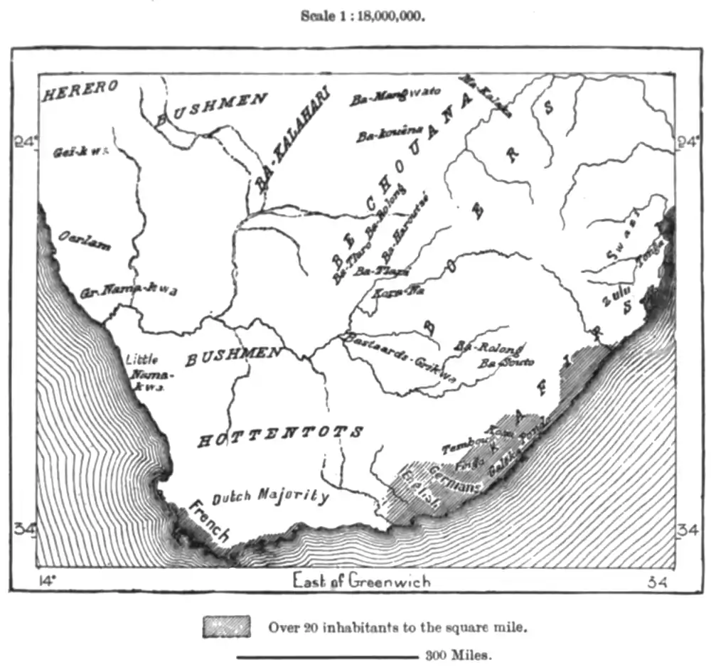 their Kafir neighbours, whose domain they were gradually encroaching upon. On both sides predatory expeditions and cattle-lifting raids were incessant; but towards the close of 1434, the year of the great trek, these troubles broke out into a general war. The English were not prepared for the organised attack of a whole nation. In the course of a few weeks all the eastern border lands were overrun, the farmsteads given to the flames, the herds captured to the number of about two hundred and fifty thousand, and all the squatters either driven west or overtaken and massacred. Governor d'Urban thereupon summoned all available