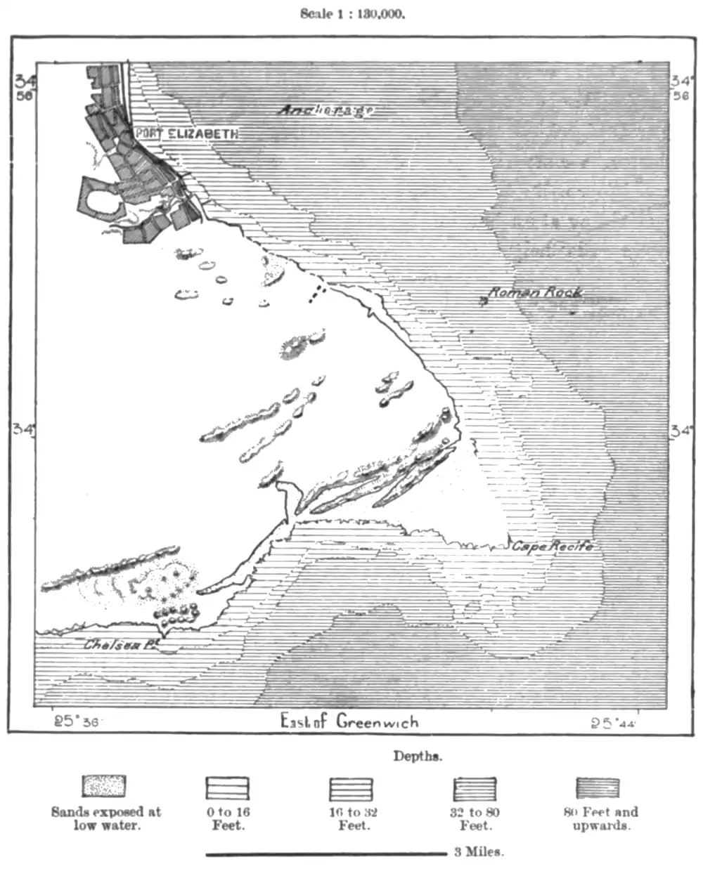 Port Elizabeth covers a considerable space on a gently sloping hill, at the foot of which its main thoroughfare runs for nearly 3 miles parallel with the beach. Its growing suburbs stretch along the roads leading inland, while beyond the upper town a bare plateau is covered by the tents of the "location," or native