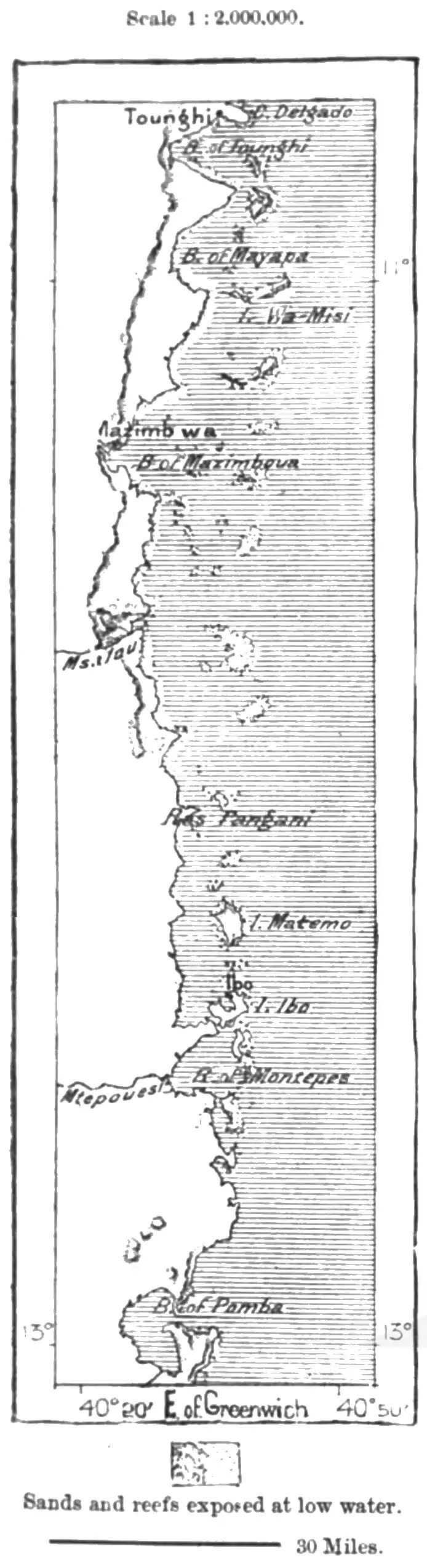 Between Quelimane and Mozambique the coral-builders have erected a continuous chain of reefs and islets, skirting the coast at a distance ranging from 12 to 18 or 20 miles, and enclosing a broad channel, which in many places affords good anchorage. Natural harbours of refuge follow in quick succession along this marine highway within the reefy Primeira and Angosha (Angoxa[1]) islets. But at the point where the shove-line takes the direction from south to north, these outer roadsteads are replaced by harbours formed by erosive action on the coast itself, There the port of Mokambo develops an extensive basin where whole fleets might ride at anchor in depths ranging from 60 to 90 feet. Mozambique commands from its low islet a labyrinth of inner havens, followed northwards by Conducia Bay and the magnificent group of sheltered inlets presented by the Ferñao Vellozo or Masasima basin. Memba Bay, with those of Mwambi, Montepes, Ibo, Masimbwa, and Mayapa, not to speak of the many excellent anchorages formed by the islets off the coast, render this seaboard one of the most favourable for navigation in the whole world. At the same time the barrier reefs and the swift currents striking against them require great caution on the part of skippers frequenting these waters. Even 60 miles