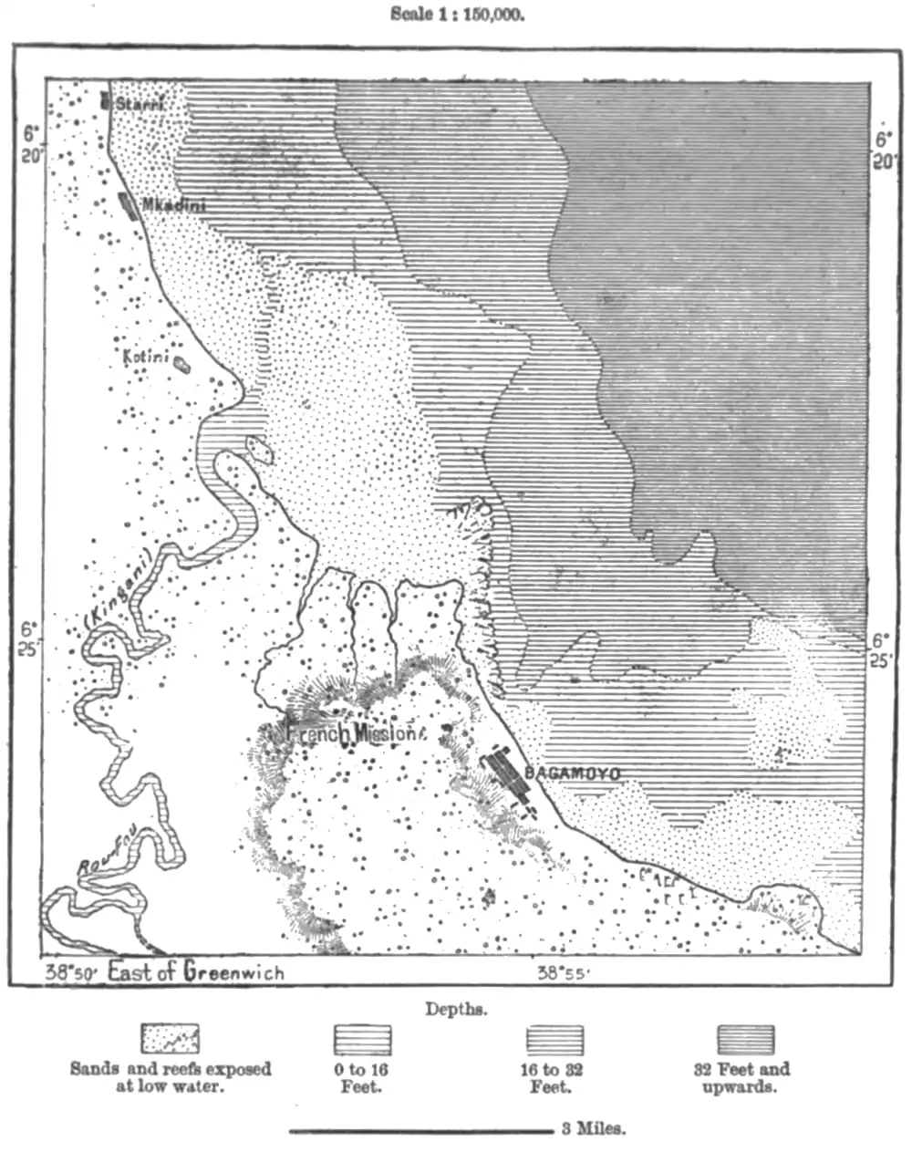 Saadani, lying some 30 miles farther north, occupies a position somewhat analogous to that of Bagamoyo. Like this place, it is situated on the strait of Zanzibar, over against the island, and in the immediate vicinity of an estuary, that of the river Wami. But the roadstead is much less frequented, the local population scarcely exceeds two thousand, and here are organised few caravans for the