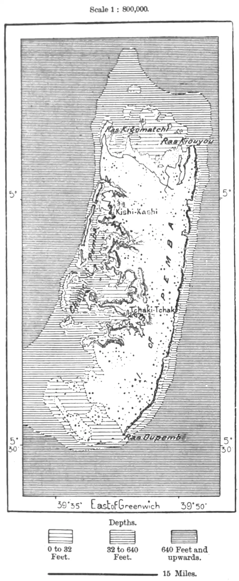 Shaki-Shaki, capital of Pemba, lics on the west side, near the head of a creek inaccessible to shipping at low water. Fig. 102. — Pemba.
