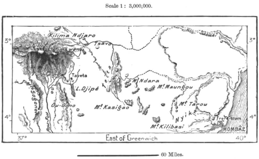 These uplands are followed towards the north-west by the Paré range, beyond which the horizon is broken by the Ugono ridge, dominating on the west the charming Lake Jipé, and north of which towers the imposing mass of the giant of African mountains. On the continually ascending plains, which extend from the coast at Mombaz towards Kilima-Njaro, the surface is strewn with granite eminences from 4,000 to 5,000 feet, which in several places are disposed in the form of regular ranges. Such peaks as Kilibasi, or Kilimabasi, that is, the