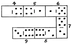 It will be seen in the illustration that the full set of twenty-eight dominoes is arranged in the form of a square frame, with 6 against 6, 2 against 2, blank against blank, and so on, as in the game. It will be found that the pips in the top row and left-hand column both add up 44. The pips in the other two sides sum to 59 and 32 respectively. The puzzle is to rearrange the dominoes in the same form so that all of the four sides shall sum to 44. Remember that the dominoes must be correctly placed one against another as in the game.
