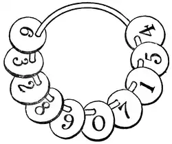 It will be seen from the illustration that there are ten of these checks on a ring, numbered 1 to 9 and 0. The puzzle is to divide them into three groups without taking any off the ring, so that the first group multiplied by the second makes the third group. For example, we can divide them into the three groups, 2—8 9 0 7—1 5 4 6 3, by bringing the 6 and the 3 round to the 4, but unfortunately the first two when multiplied together do not make the third. Can you separate them correctly? Of course you may have as many of the checks as you like in any group. The puzzle calls for some ingenuity, unless you have the luck to hit on the answer by chance.
