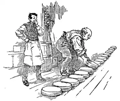 The cheesemonger depicted in the illustration is an inveterate puzzle lover. One of his favourite puzzles is the piling of cheeses in his warehouse, an amusement that he finds good exercise for the body as well as for the mind. He places sixteen cheeses on the floor in a straight row and then makes them into four piles, with four cheeses in every pile, by always passing a cheese over four others. If you use sixteen counters and number them in order from 1 to 16, then you may place 1 on 6, 11 on 1, 7 on 4, and so on, until there are four in every pile. It will be seen that it does not matter whether the four passed over are standing alone or piled; they count just the same, and you can always carry a cheese in either direction. There are a great many different ways of doing it in twelve moves, so it makes a good game of "patience" to try to solve it so that the four piles shall be left in different stipulated places. For example, try to leave the piles at the extreme ends of the row, on Nos. 1, 2, 15 and 16; this is quite easy. Then try to leave three piles together, on Nos. 13, 14, and 15. Then again play so that they shall be left on Nos. 3, 5, 12, and 14.