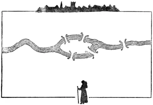 over all the five bridges. Then trace out a second route, then a third, and see if you can count all the variations. You will find that the difficulty is twofold: you have to avoid dropping routes on the one hand and counting the same routes more than once on the other.