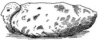 While, as regards most of its surface, this stone does not differ from an ordinary bowlder, there is an exception in the appearance of one end. This has been carved into the form of a human head, looking out, as it were, from the end of the stone. The features are aquiline, rudely carved, and somewhat irregular, as though chiseled by an unskilled hand. They present the appearance of having been worked out upon the surface of the stone by using certain hard protuberances as the basis for the more prominent features and graving the rest to correspond. The artist has apparently seized upon a rude semblance of the human face presented, and worked out the finer lineaments to correspond.
