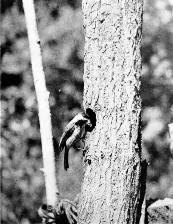 CHICKADEE AT NEST-HOLE, WITH FOOD FOR YOUNG
