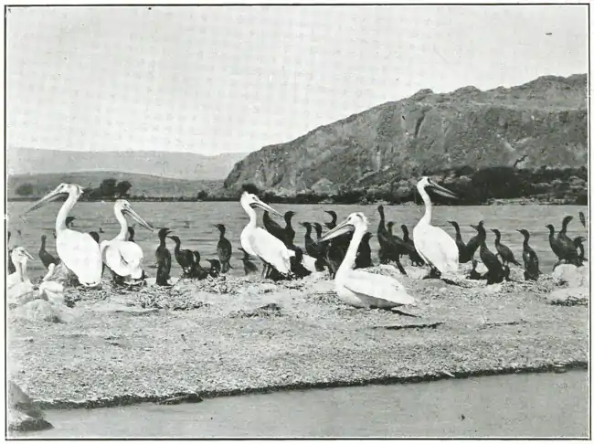 The summer of 1895, we had a chance to make an intimate study of the white pelican in its home on the lakes of southern Oregon. I have never seen this bird plunge for its fish as the brown pelican does, but those we watched always swam along and with a swift motion scooped up the fish here and there from the surface. The birds were so plentiful about Tule Lake that we were anxious to find where they were nesting.