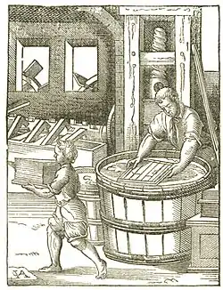 [From Jost Amman.]In this illustration, which was first published by Jost Amman in his Book of Trades, we see something of the mechanism always used for preparing the pulp for paper. Large water-wheels, partially seen through the window, set in motion a wooden cylinder evenly spiked with projections. As the cylinder revolved, these projections tilted up, and then dropped heavy stampers of hard wood that beat against the torn and well-soaked rags lying within the tank. The stamping was continued until the macerated rags were of the consistency of cream. The stuff thus made was then transferred to tubs, at one of which a