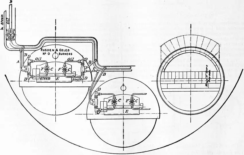 Fig. 2 shows a burner of Rusden and Eeles’ patent as generally used on board ships for the purpose of injecting the oil. A is a movable cap holding the packing B, which renders the annular spindle M oil and steam tight. E is the outer casing containing the steam jacket from which the steam, after being fed through the steam-supply pipe G, passes into the annular space surrounding the spindle P. It will be seen that if the spindle P be travelled inwards by turning the handle N, the orifice at the nozzle RR will be opened so as to allow the steam to flow out radially. If at the same time the annular spindle M be drawn inwards by revolving the handle L, the oil which passes through the supply pipe F will also have emission at RR, and, coming in contact with the outflowing steam, will be pulverized and sprayed into the furnace. Fig. 3 is a profile and plan of a steamer adapted for carrying oil in bulk, and showing all the storage arrangements for handling liquid fuel. Fig. 4 shows the interior arrangement of the boiler furnace of the steamship “Trocas.” A is broken fire-brick resting on the ordinary fire-bars, B is a brick bridge, C a casing of fire-brick intended to protect the riveted seam immediately above it from the direct